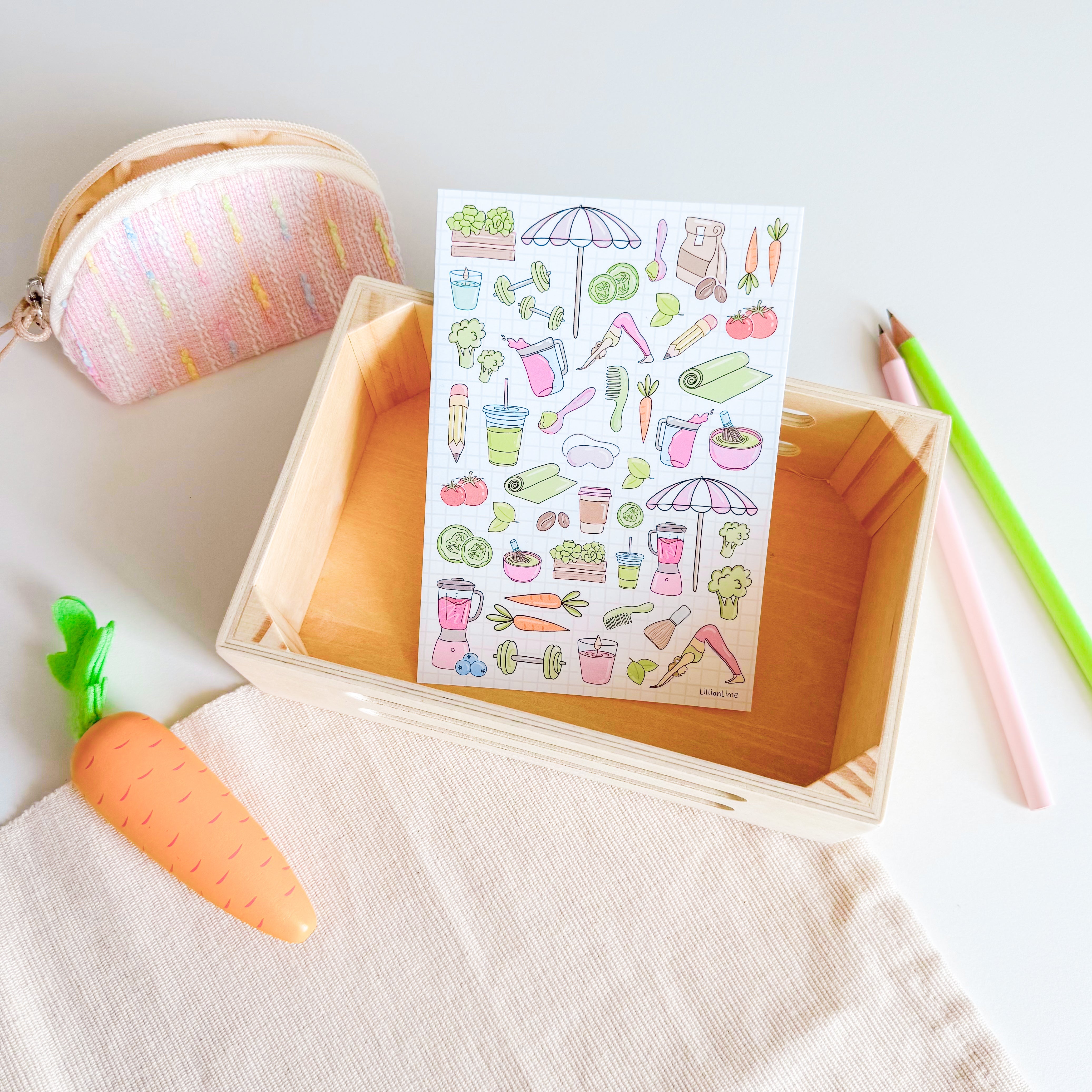 Auf dieser Karte findest du alle Self Care Essentials, die Dich gut fühlen lassen! Das süße Motiv inspiriert und verschönert einfach jede Pinnwand.