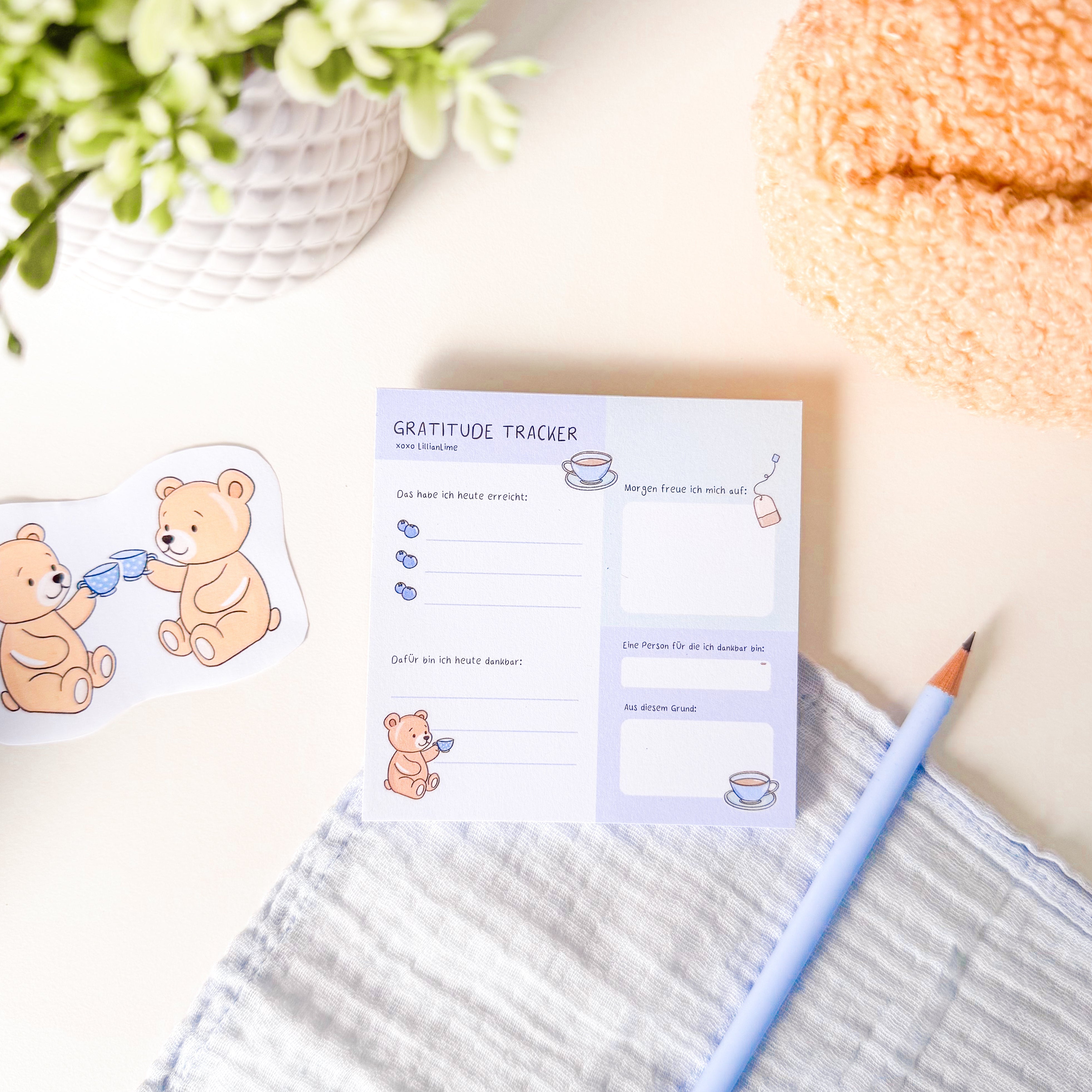 Auf diesem süßen quadratischen Block im Teddy Design dreht sich alles um das Thema Dankbarkeit. Notiere hier, was du heute erreicht hast, wofür du dankbar bist, worauf du dich morgen freust und eine Person für die du dankbar bist. Mit diesen Fragen reflektierst du deinen Tag optimal und fokussierst dich auf die schönen Dinge im Leben!