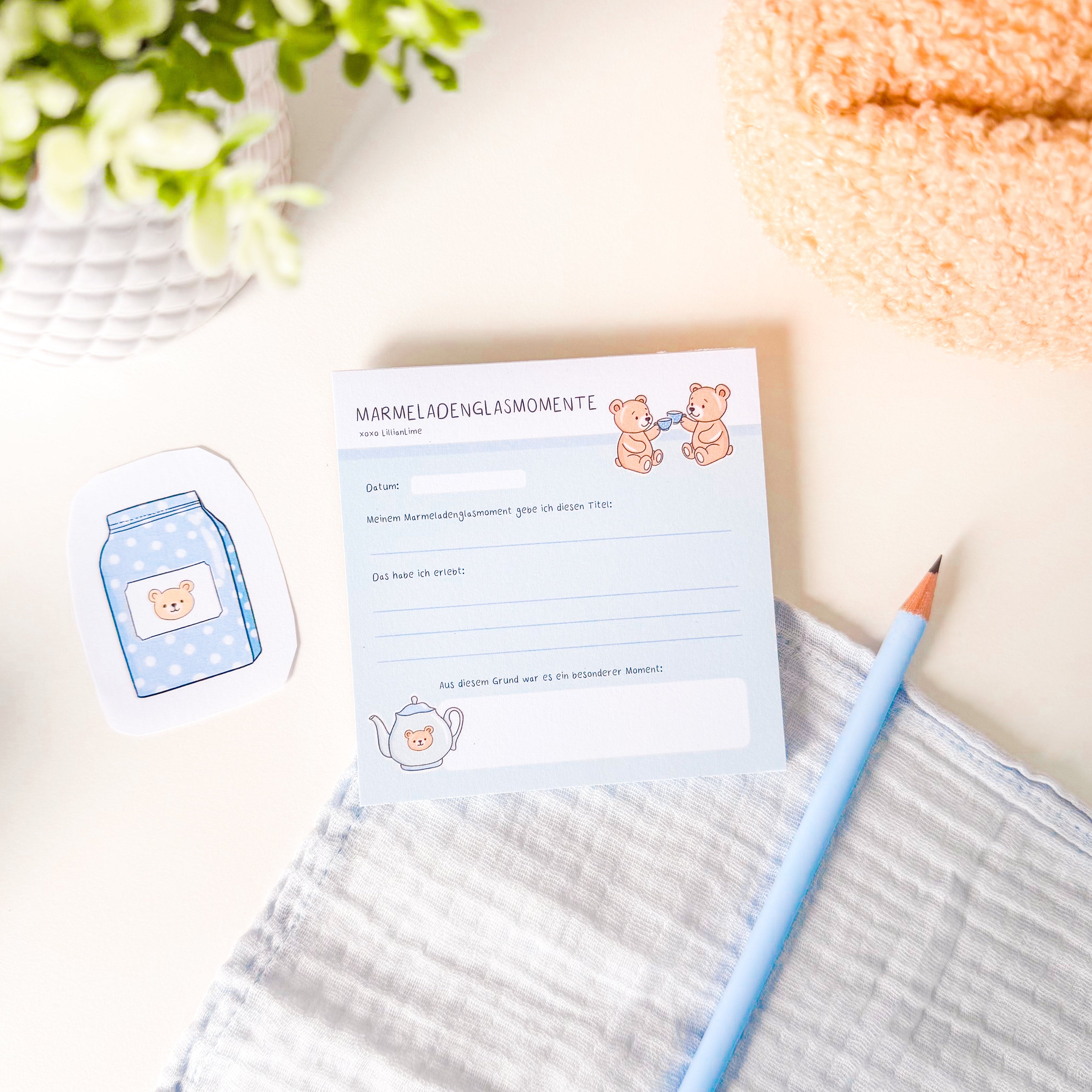 Dieser süße quadratische Block im Teddy Design bietet Platz für all deine Marmeladenglasmomente! Ein Marmeladenglasmoment ist ein Moment, in dem du richtig glücklich warst und das Leben sich leicht angefühlt hat. Halte diesen Moment auf dem süßen Teddy Block fest, damit er nicht verloren geht und du dich immer daran erinnern kannst. Um alle Momente an einem Ort zu haben, kannst du die einzelnen Zettel in einem großen Glas sammeln.